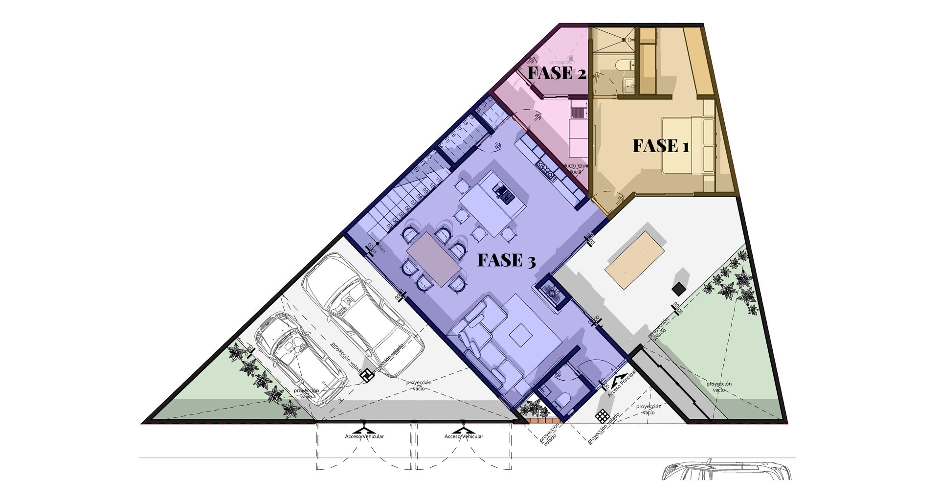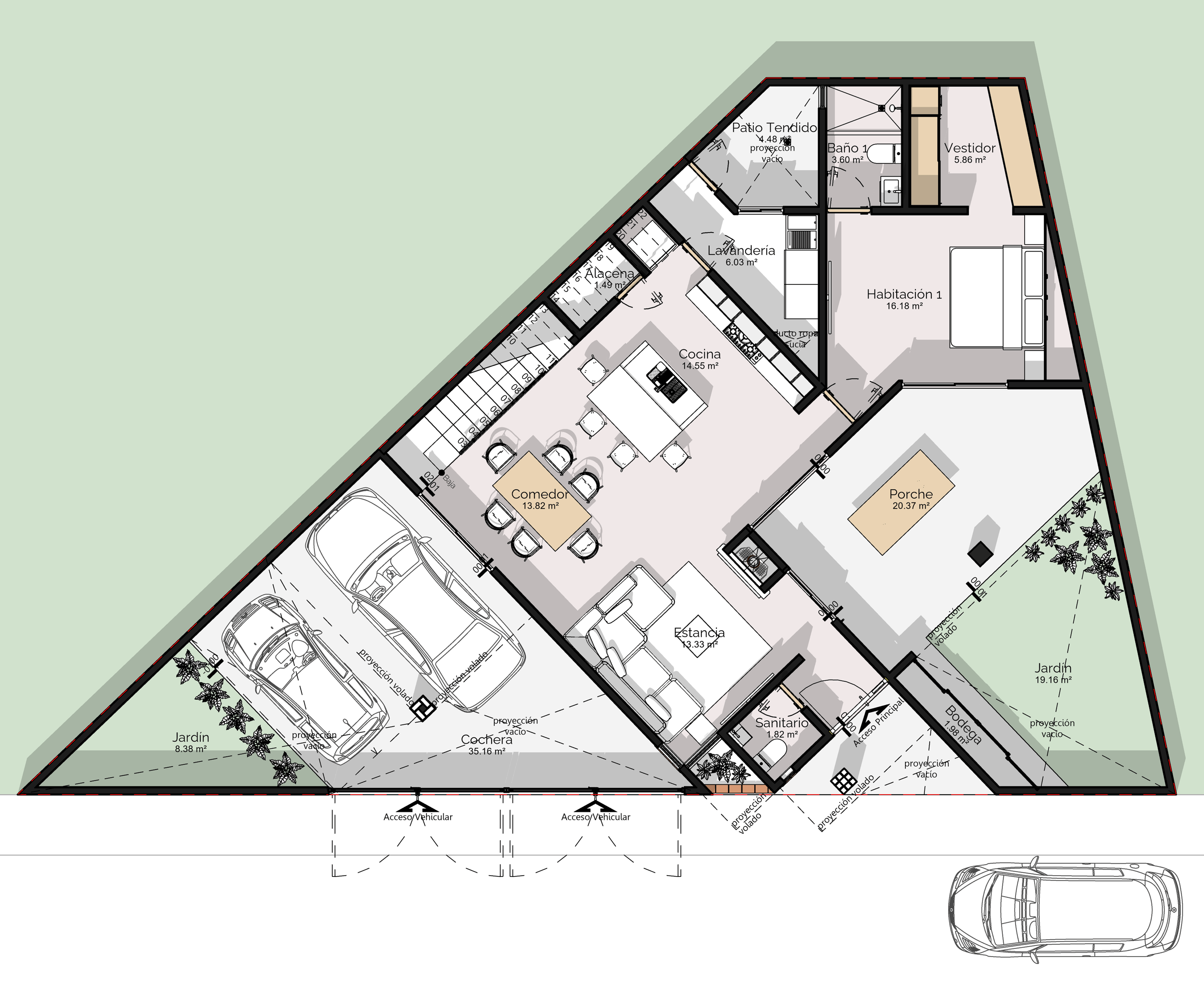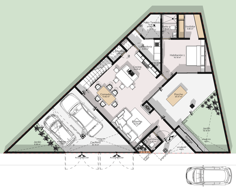 La forma del terreno terminó por definir todo: la posición de los espacios, la entrada vehicular, el porche, y los jardines que se resuelven en los ángulos que de otra manera se hubieran desperdiciado. Nada sobró.