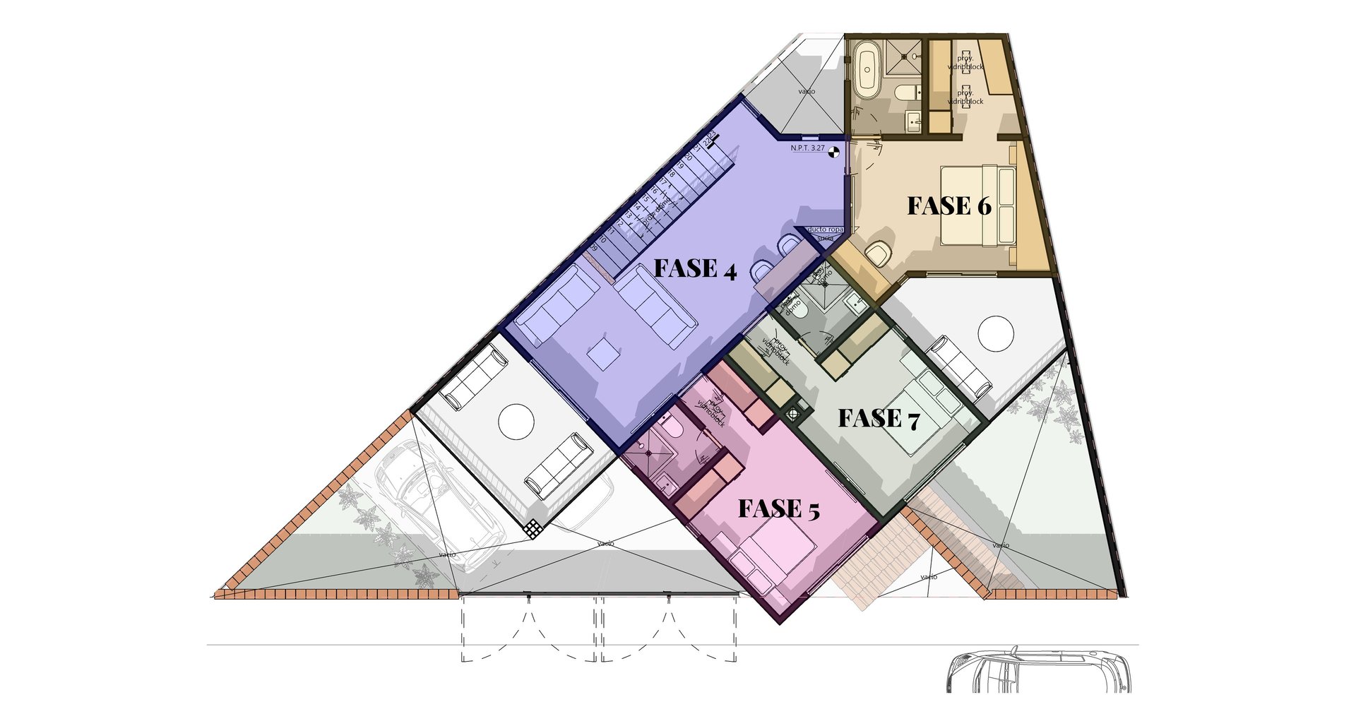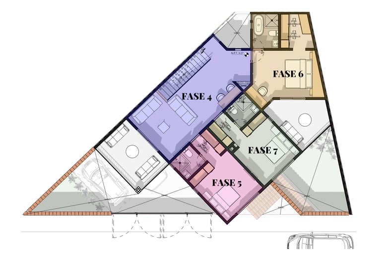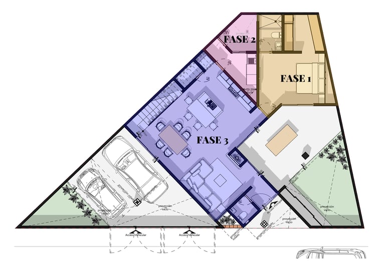 La estrategia de fases: Diseñar por etapas no es una limitación, es una decisión inteligente. En este proyecto la primera fase es la recámara de planta baja, con baño completo y vestidor. Ese espacio funciona como un mini departamento desde el primer día: pueden cocinar con una parrilla y un tanque de gas, instalar una tarja temporal y usar el baño con normalidad. Ya supera con creces el cuarto pequeño donde los tres viven hoy.