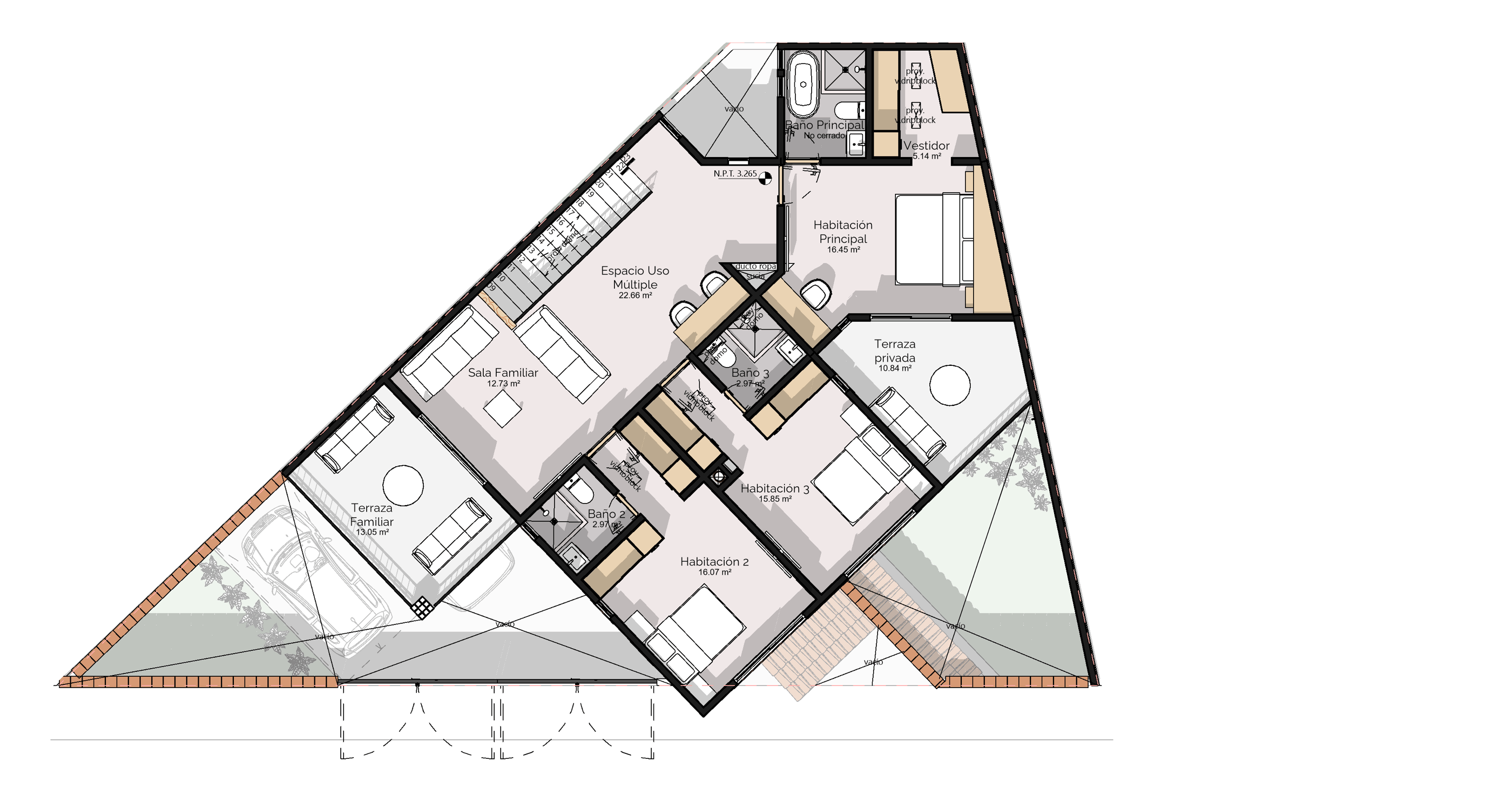 El terreno y el clima: El Desierto de los Leones es una zona boscosa y fría. Las mañanas son frescas casi todo el año y en invierno las temperaturas bajan considerablemente, así que la orientación solar no era un detalle opcional: era parte del diseño desde el primer trazo. Queríamos que las recámaras recibieran sol por las mañanas, lo que significa orientarlas hacia el sur. El problema es que la geometría triangular del terreno no te regala esa orientación, hay que ganársela.