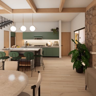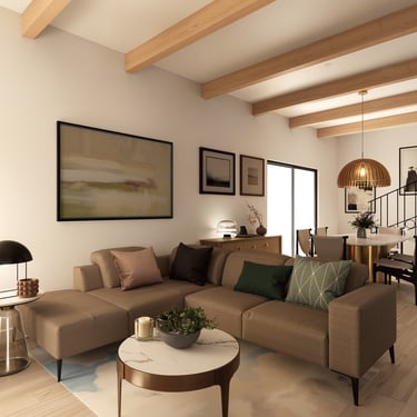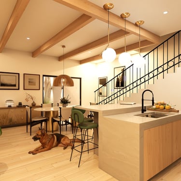 Planta baja: El corazón social de la casa es un espacio abierto que integra estancia, comedor y cocina. Las vigas de madera expuestas dan escala y calidez sin necesidad de mucho más. Este espacio era especialmente importante para Rocío: vienen de un lugar pequeño y lo que más necesitaban era amplitud.