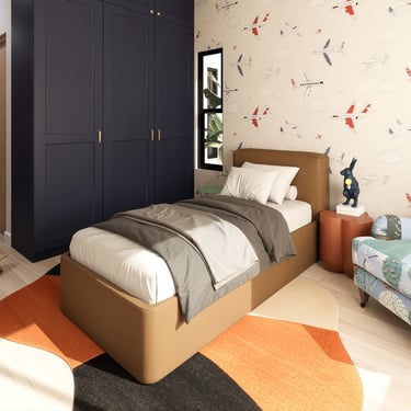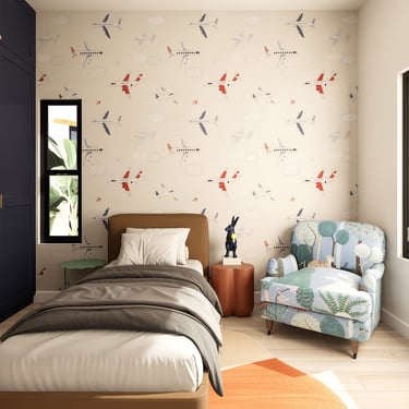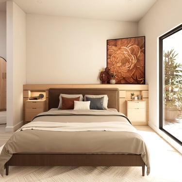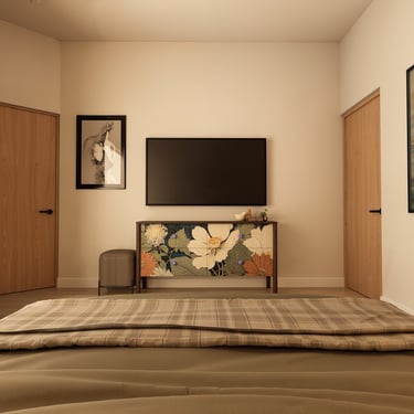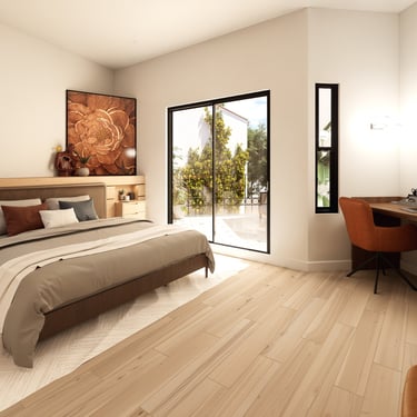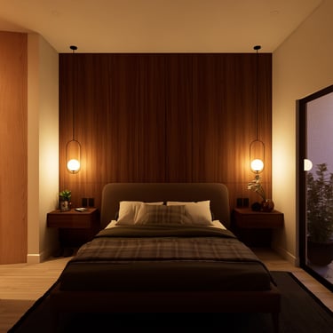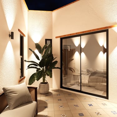 Planta alta: La planta alta es más privada. La recámara principal tiene acceso directo a una terraza que da al jardín interior, con una vista que en el render nocturno se llena de flores amarillas. Hay además dos recámaras secundarias con baños propios, una sala familiar, terraza común y un espacio de uso múltiple que puede ser lo que la familia necesite en cada etapa: estudio, zona de juegos, oficina. Con un hijo pequeño hoy, esas necesidades van a cambiar. La casa está pensada para eso.