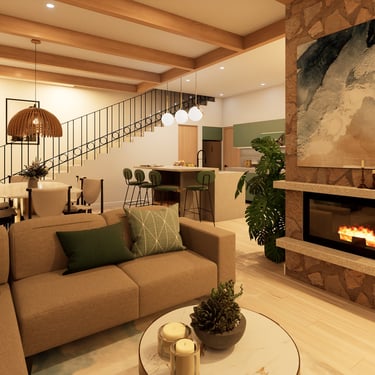 La estancia tiene chimenea real. Su ubicación no fue arbitraria: el tiro de la chimenea ayuda a calentar las recámaras de la planta alta, algo que consultamos directamente con un proveedor de chimeneas local. En planta baja hay tres áreas exteriores: la cochera con jardín, y el jardín interior que ilumina el porche ubicado entre la recámara y la zona social. Eso nos da ventilación cruzada por toda la planta, algo que en el clima del Desierto de los Leones se agradece en las temporadas de calor.