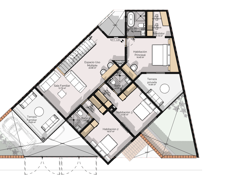 Historia del Proyecto: Cuando Rocío y Antonio llegaron a mi taller, traían un boceto dibujado a mano. No era un plano técnico, era una idea: lo que pensaban que podría funcionar en su terreno. Un terreno triangular de 200 m² en el Desierto de los Leones, al poniente de la Ciudad de México, con tres colindancias que no forman ningún ángulo recto.