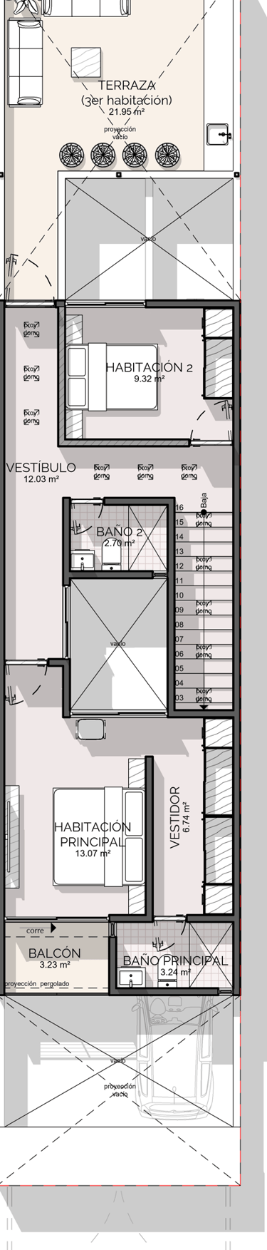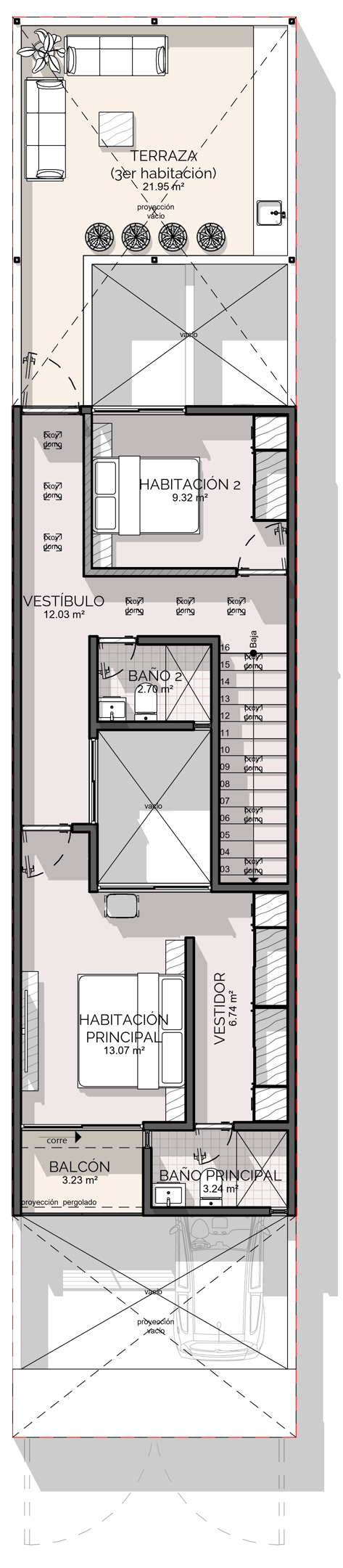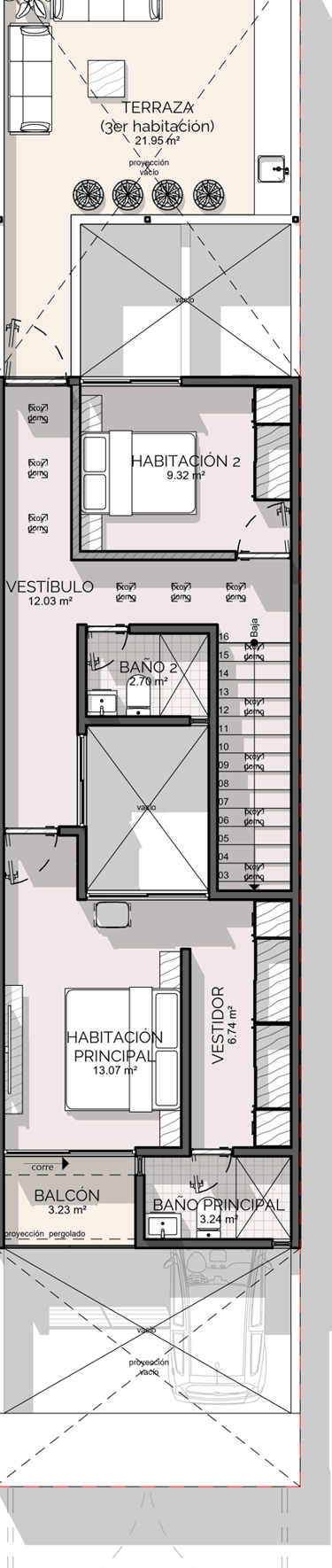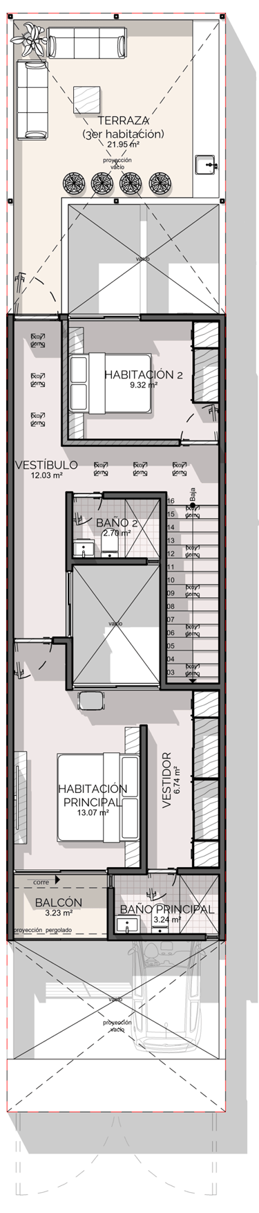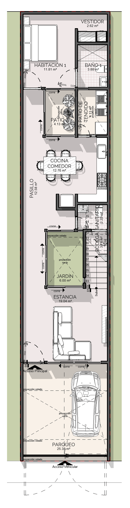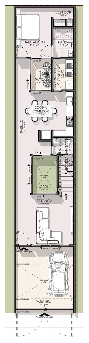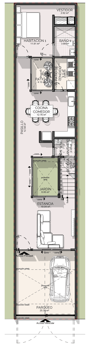 Cuando me cuentan esto, comprendo la situación de poca confianza con la que se acercaron conmigo, pero también lo vi como una gran oportunidad de entregarles un proyecto muy bonito, funcional y que logrará espacios increíbles con las condiciones del terreno bien particulares, de 5 metros de ancho por 25 metros de largo. Donde nos preocupaba la iluminación y ventilación de los espacios.