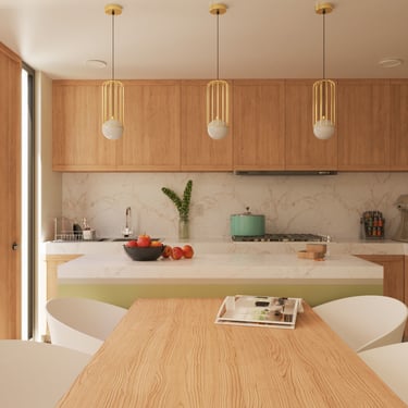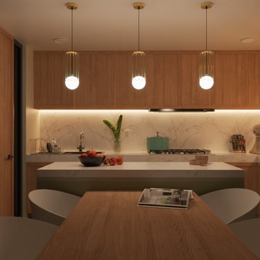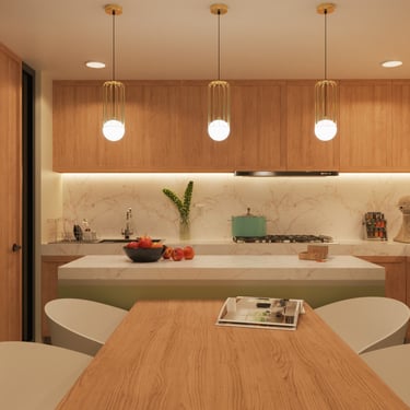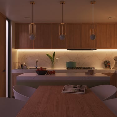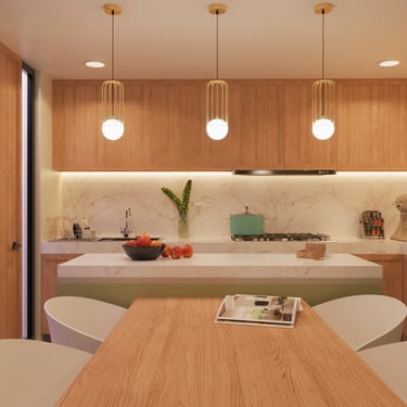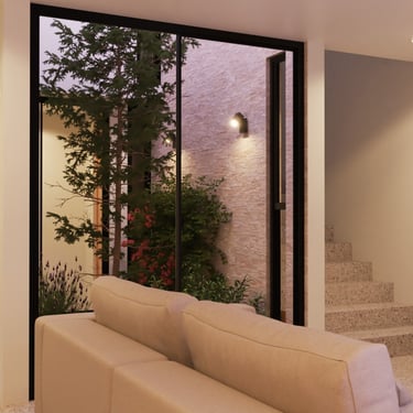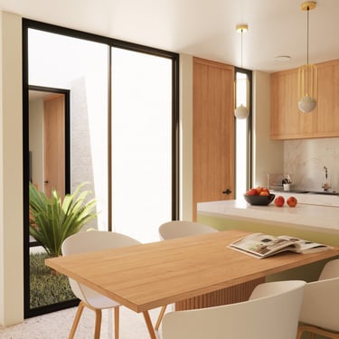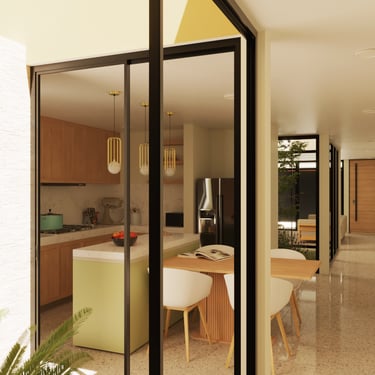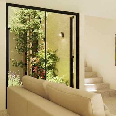 En la estancia, tenemos un ventanal que da a la cochera para poderlo abrir en momento de fiestas familiares para ampliar el espacio. Este espacio colinda con el primer jardín interior que tiene las escaleras de un lado que nos llevan a la segunda planta y en el otro lado, un pasillo que nos conecta con la cocina comedor que comparten espacio debido a las dimensiones del terreno, y aquí tenemos dos opciones de acomodo, como lo ves en la imagen con la mesa de forma independiente y también con una mesa en tipo barra desayunadora como podrás ver en los renders.